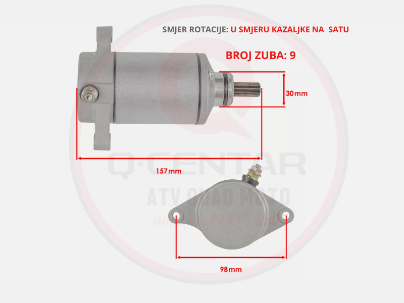 Radni napon od 12 V osigurava kompatibilnost sa standardnim električnim sistemima ATV vozila. Precizno definisan razmak montažnih rupa od 98 mm omogućava jednostavnu ugradnju bez prepravki, dok dimenzije pogona garantuju pravilno zahvatanje zupčanika anlasera.