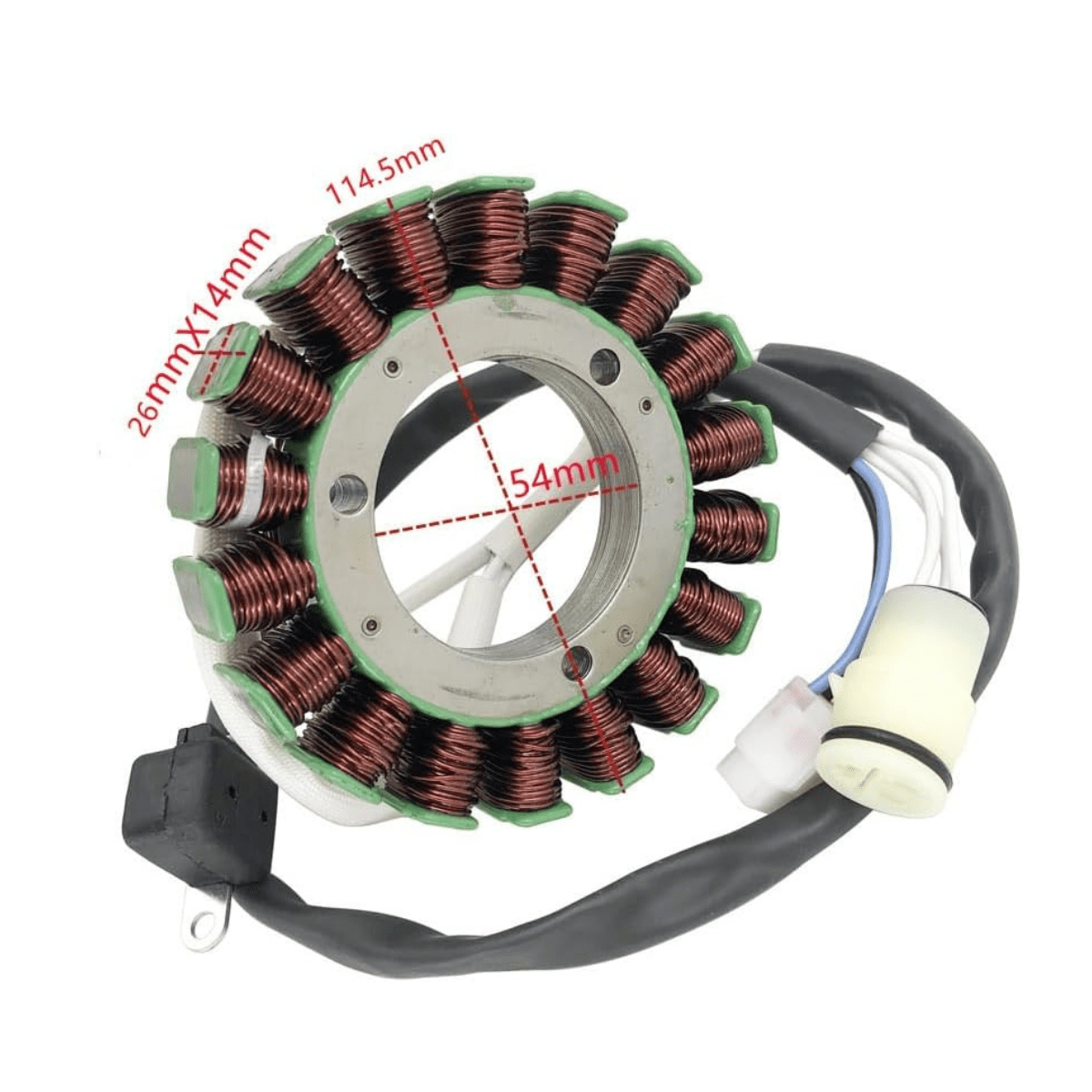 Stator je precizno izrađen sa ukupno 18 zavojnica, što osigurava stabilan napon i pouzdano punjenje čak i pri višim obrtajima motora. Kvalitetna izolacija i otpornost na temperaturu garantuju dug vijek trajanja i pouzdan rad u zahtjevnim terenskim uslovima.